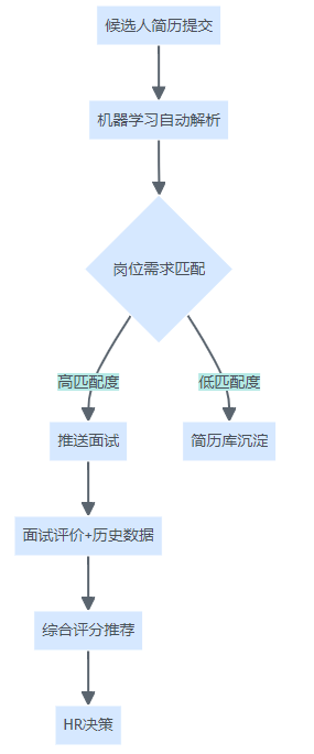 招聘流程中机器学习自动解析简历、岗位匹配、面试评价和HR决策的流程结构图