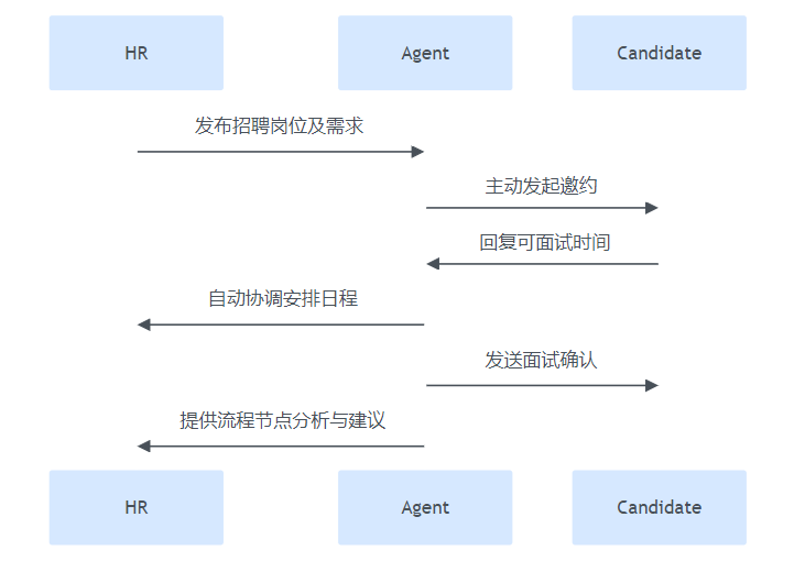 AI智能体在招聘中主动邀约、协调面试、辅助决策的流程时序图