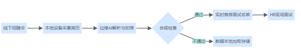 边缘AI和小模型在招聘现场实现本地简历采集、解析、合规检查和面试推荐的流程结构图