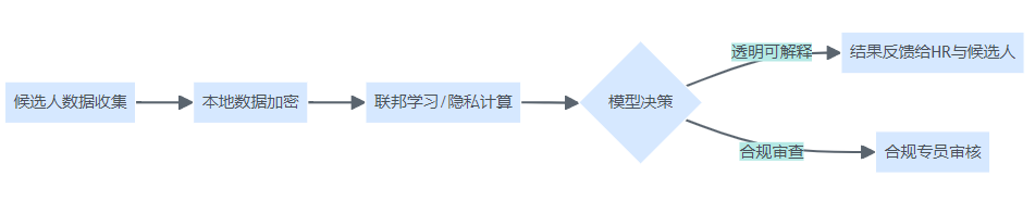 招聘系统实现数据加密、联邦学习、模型透明决策与合规审查的治理结构图