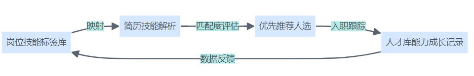 技能标签与简历技能自动映射、推荐、成长记录与岗位需求动态反馈的技能导向型招聘流程图