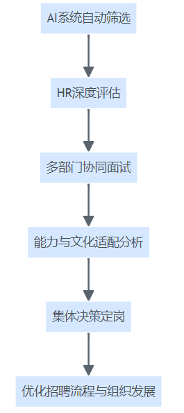 AI系统与HR团队协同分工、能力评估、集体定岗与组织发展的招聘流程结构图