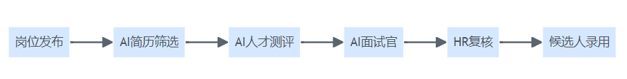 图1:AI智能招聘流程结构,包含岗位发布、简历筛选、人才测评、AI面试、HR复核与候选人录用六大环节。