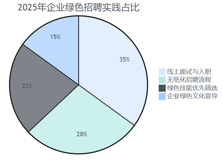 2025年企业绿色招聘各项措施占比饼图,包括线上面试、无纸化流程、绿色技能筛选和文化宣导。