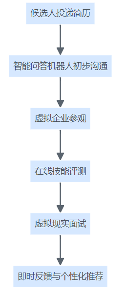 沉浸式招聘流程,包括投递简历、智能沟通、虚拟参观、在线评测、虚拟面试和个性化反馈等环节。