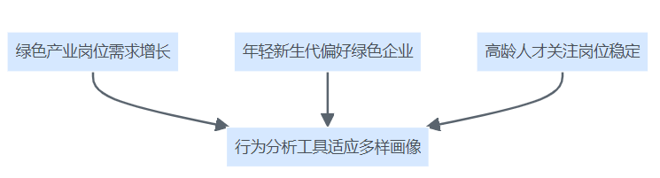 2025年,绿色经济和可持续发展目标推动了企业招聘需求的转型,也进一步丰富了求职者行为分析的应用场景。随着绿色制造、环保科技、新能源等行业快速发展,企业对于具有绿色技能和环保意识的专业人才需求显著提升。