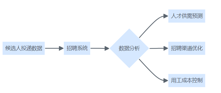候选人投递数据经招聘系统分析,实现人才供需预测、渠道优化及用工成本控制。