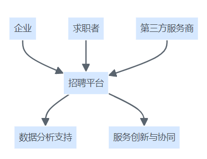 招聘平台生态结构图,展示企业、候选人、服务商等多方共建数字招聘平台生态。