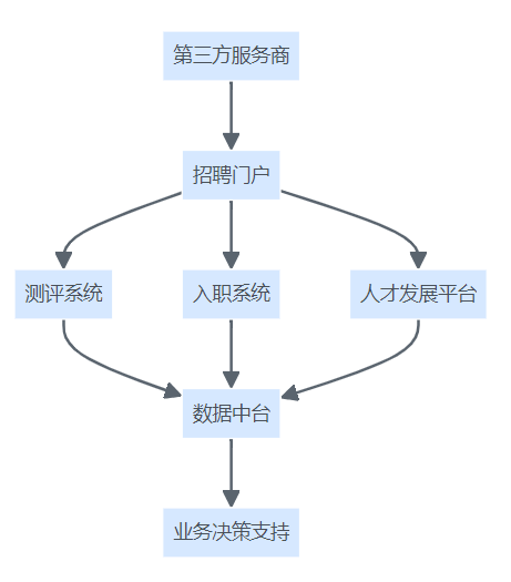 超级系统集成架构图,展示企业招聘各模块与第三方服务高效集成的数据流与业务协同路径。