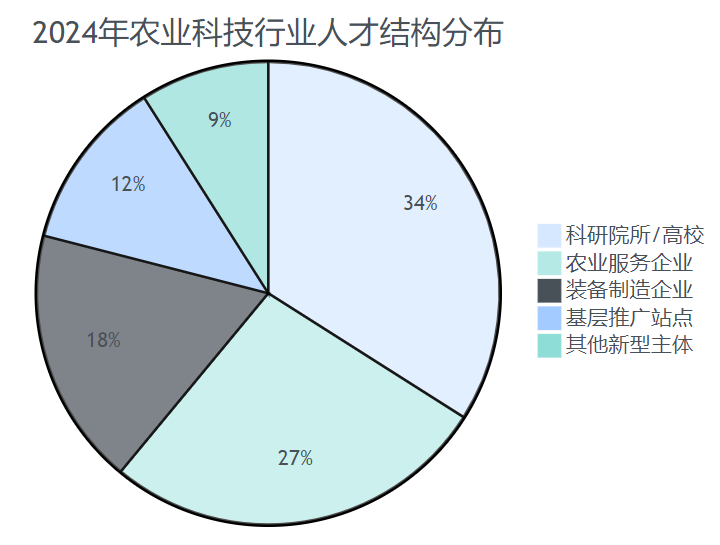 2024年农业科技行业人才结构分布饼图,科研院所/高校占比最高,其次为农业服务企业。
