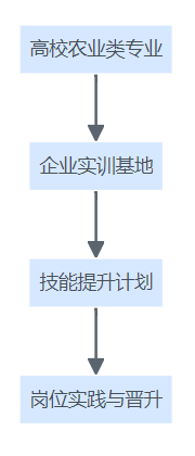 农业科技人才培养与技能提升流程图,从高校到企业实训、技能提升、岗位晋升一体化路径。