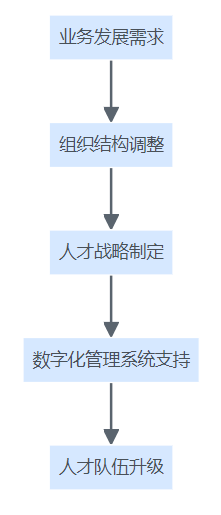 农业科技企业人才战略协同调整结构图,从业务需求到组织结构、人才战略、系统支持、队伍升级。