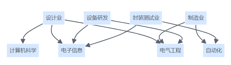 芯片半导体主要岗位与专业人才流向结构图,设计业与电气工程等专业关联紧密。