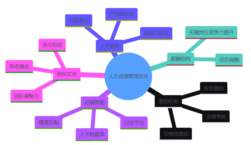 芯片半导体行业人力资源管理优化建议思维导图,涵盖薪酬、激励、培养、招聘与文化五大方向。