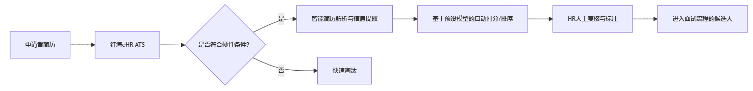 这张流程图清晰展示了红海eHR如何赋能筛选环节:通过自动化工具(硬性条件过滤、简历解析、智能打分)处理海量申请,极大提升效率;同时保留HR在关键节点(复核、标注)的专业判断,确保精准度。系统自动统计各环节人数,精确计算筛选率,让效率和质量一目了然。
