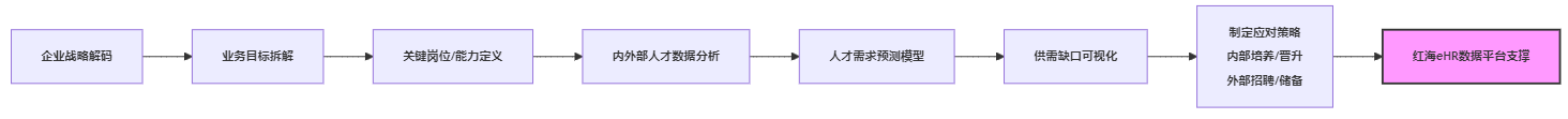 场景化实践: 某国内领先的零售集团计划在三年内将数字化渠道销售额提升至总营收的50%。传统的HR做法可能是根据现有电商部门编制进行线性扩招。而基于人才供应链思维,HR团队首先联合战略部、业务部,拆解战略目标:需要哪些新岗位(如AI算法工程师、全渠道运营总监)?现有人员需提升哪些技能(如数据分析、用户增长)?外部市场相关人才的供给情况如何?结合历史流失率、内部晋升率、行业流动数据(如LinkedIn人才流动报告)进行多维度建模预测。红海eHR的一体化平台在此环节发挥关键作用:它打通了战略目标库、组织架构树、历史人事数据(晋升、调动、离职)以及外部行业数据库,内置预测算法模型。HR只需设定战略目标参数,系统即可自动输出未来1-3年关键岗位的供需缺口热力图、技能缺口雷达图以及内部人才储备水位报告,为决策提供坚实的数据支撑。