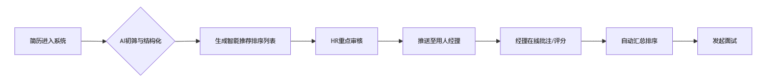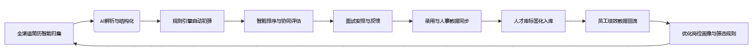 智能筛选中枢: 前文所述的AI解析、规则引擎、全渠道接入、结构化提取能力,仅为系统人才吸纳模块的基座。筛选环节沉淀的岗位画像、候选人能力标签,自动同步至面试评估表。