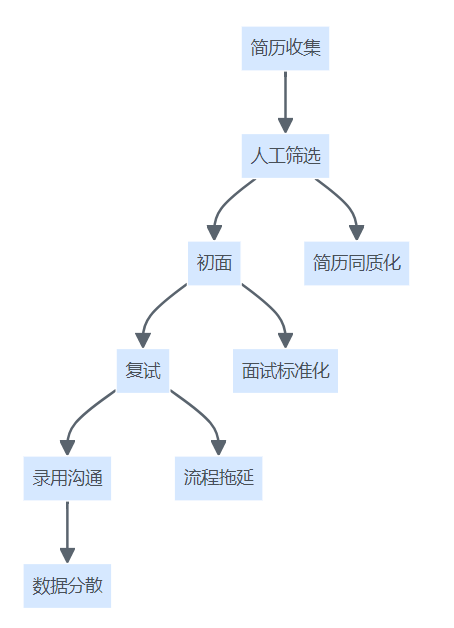 校园招聘流程与痛点分布结构图,展示简历收集、筛选、面试、录用等环节的典型问题。