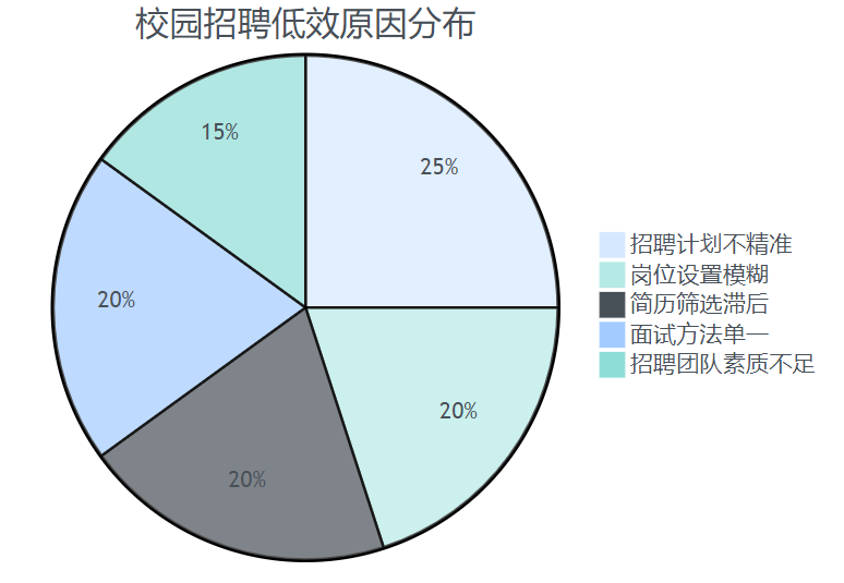 校园招聘低效的主要原因分布饼图,分别显示招聘计划、岗位设置、筛选工具、团队素质、面试方法等占比情况。
