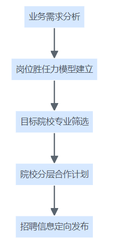 企业校园招聘目标院校选择与合作流程结构图,展示业务分析、岗位模型、专业筛选、院校分层、定向发布信息等环节。