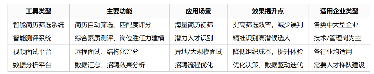 主流校园招聘工具类型与功能对比表,展示不同工具的功能、应用场景、效果及适用企业类型。