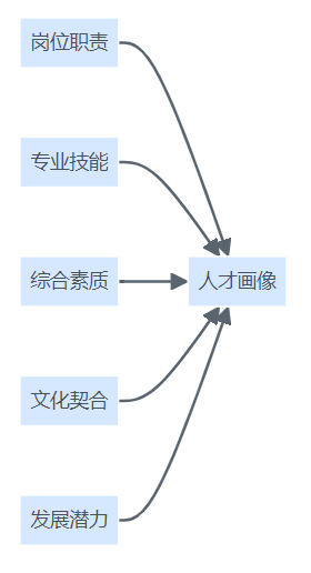 人才画像构建要素结构图,展示岗位职责、专业技能、综合素质、文化契合、发展潜力五大维度。