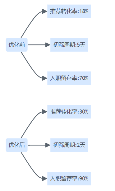 制造业与互联网企业人才推荐效率提升成效对比柱状图,展示优化前后推荐转化率、初筛周期、入职留存率的显著变化。