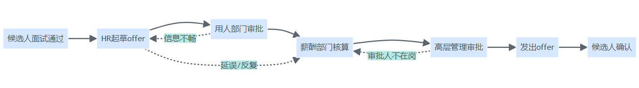 传统offer发放流程结构图,直观反映多环节审批、信息不畅、延误等效率瓶颈。