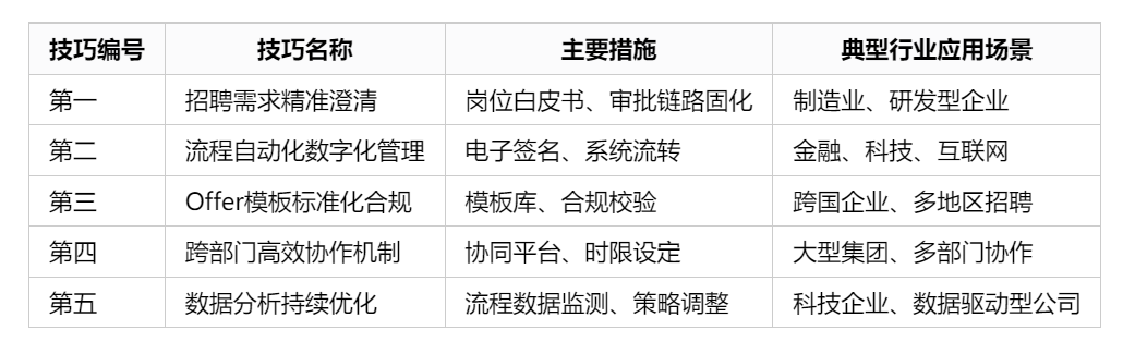 五大offer发放效率提升技巧对比表,展示措施与典型应用场景。