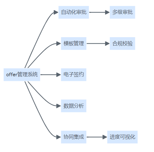 offer管理系统核心功能结构图,展示自动化审批、模板管理、电子签约、数据分析与协同集成五大板块。