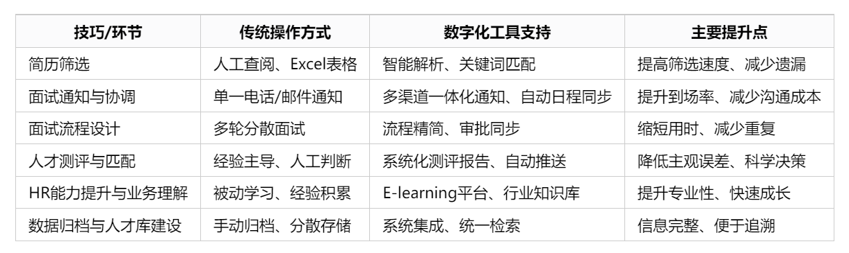 不同招聘环节中传统方式与数字化工具的效率对比(招聘环节效率对比表)
