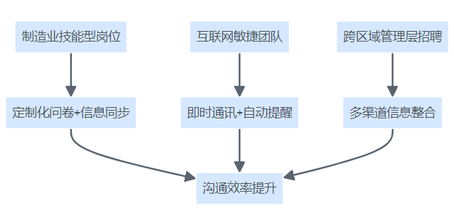 三大行业招聘场景案例结构图,展示制造业、互联网和跨区域招聘如何通过工具和流程优化提升沟通效率。