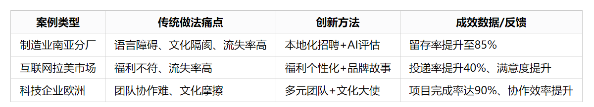 2024年初,一家中国制造企业在南亚扩建分厂,HR团队遇到招聘本地质量管理工程师的难题。传统做法——通过本地猎头筛选简历、依赖英语面试,结果入职三个月后,约有25%员工因文化隔阂或沟通不畅选择离职。企业调整策略,采用AI文化适应性评估,结合本地高校合作渠道,并让在职员工参与面试环节。数据显示,新方案下员工留存率提升至85%。