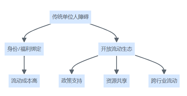 传统“单位人”模式将人才牢牢锁定在单位,流动涉及复杂手续和高成本。开放生态下,企业与政策联动,员工流动更加自由,组织也能吸引更多外部优秀人才。