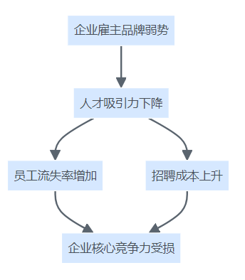 雇主品牌弱势导致人才吸引力下降、招聘成本上升、员工流失率增加,最终影响企业核心竞争力。