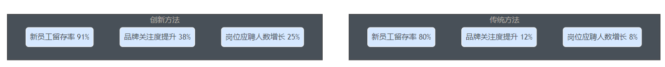柱状图对比传统雇主品牌建设方法与创新方法在新员工留存率、品牌关注度提升和岗位应聘人数增长上的效果。