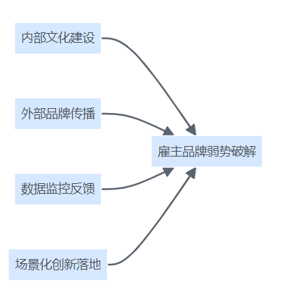 结构图展示破解雇主品牌弱势的系统性推进路径,包括内部文化建设、外部品牌传播、数据监控与场景化创新方法落地。
