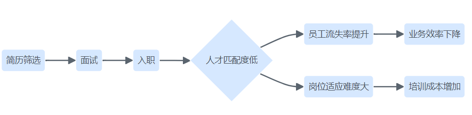 企业人才匹配度低导致员工流失率高、业务效率下降与培训成本上升的流程关系图