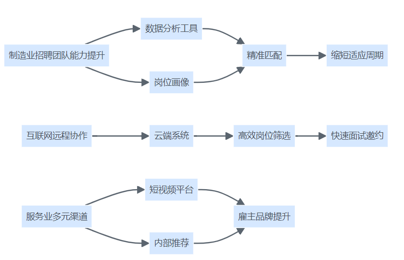 第三,招聘团队积极借力社交媒体、垂直行业社区、专业人才平台等多元渠道。服务业企业利用短视频平台,发布岗位故事和员工成长经历,吸引更多“被动求职者”主动关注企业,扩大招聘影响力。