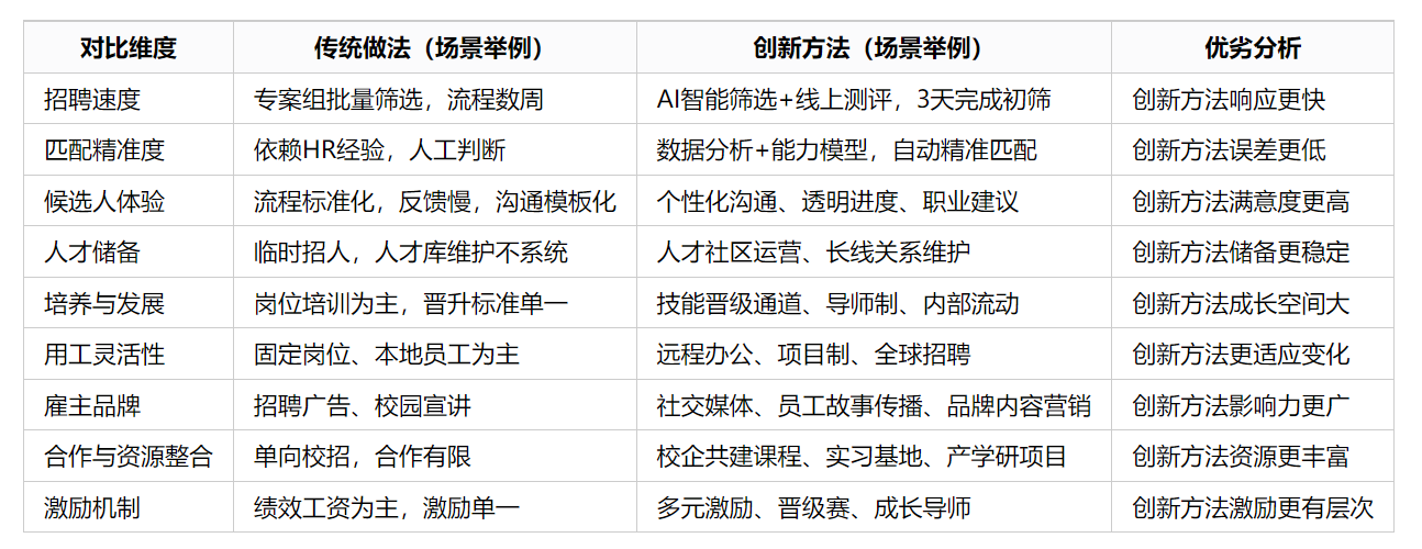 创新方法与传统做法在招聘、人才培养、用工模式等维度的对比分析表格。