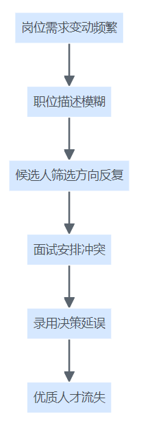 企业招聘流程混乱示意图,展示需求变动、描述模糊、筛选反复、决策延误导致人才流失的流程链条