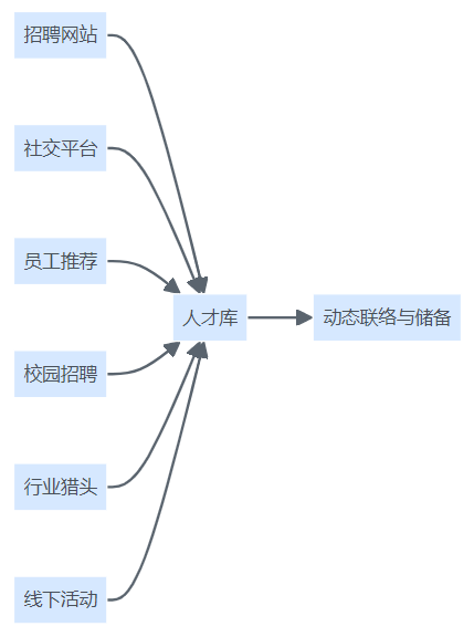 多渠道招聘与人才库构建流程图,展示各招聘渠道汇聚至人才库并进行动态管理