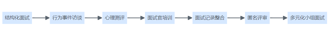 面试评估科学化与去偏见流程图,展示从面试结构到匿名评审及多元化小组面试的全流程