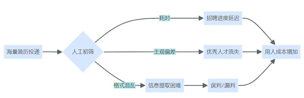 传统人工筛选:热门岗位初筛300份简历通常需要10小时以上,HR团队连续加班仍难以满足招聘节奏。