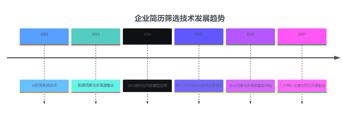 企业简历筛选技术发展趋势时间轴,展示从AI初筛到结构化内容、语义分析、人才梯队管理的演进过程。