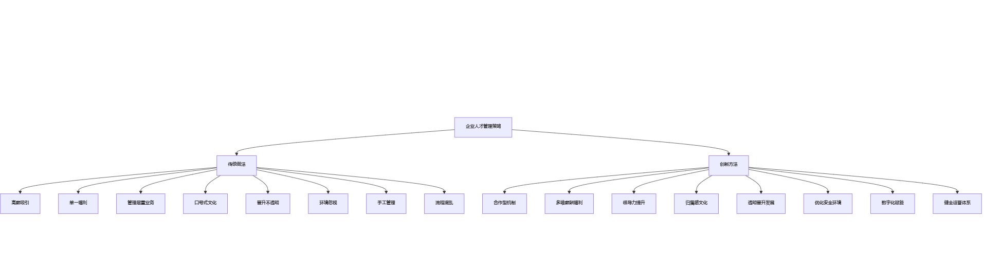 企业人才管理策略结构图,左侧为传统做法(高薪吸引、单一福利等),右侧为创新方法(合作型机制、多维薪酬福利等),直观展示两者分野。