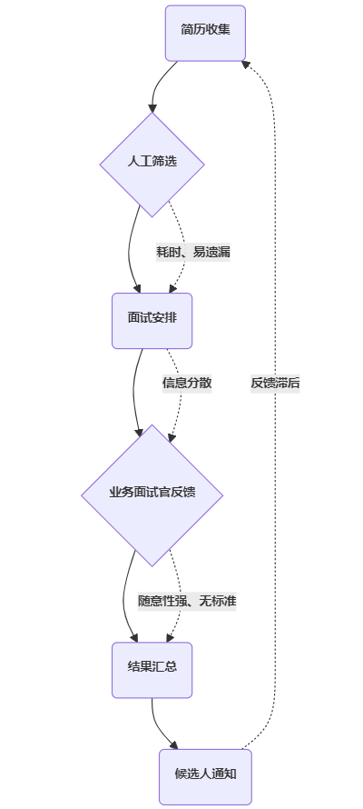 常规面试流程瓶颈结构图,展示简历筛选、面试安排、反馈、结果汇总和候选人通知环节的主要问题。