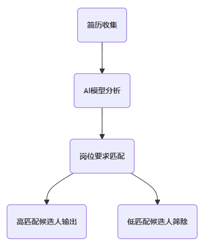 AI简历筛选流程图,展示从收集到分析、匹配和筛选的自动化步骤。
