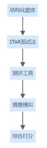面试评估流程图,依次展示结构化题库、STAR法、测评工具、情景模拟及综合打分步骤。