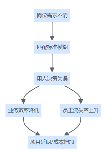 人才匹配错误在企业内部产生的连锁反应流程图,显示从需求不清到最终业务受损的路径。